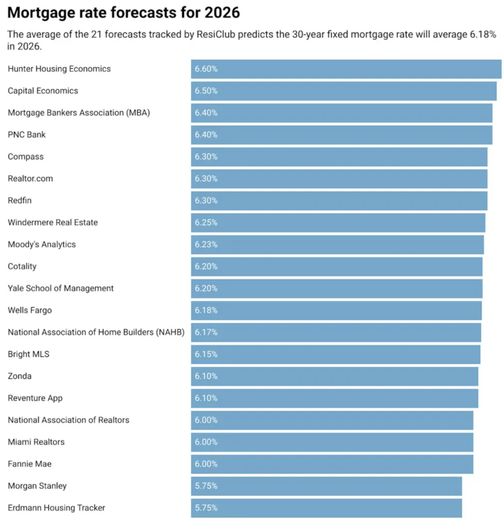 For its 2026 mortgage rate roundup, the publication said ResiClub collected 21 mortgage rate forecasts. Some were publicly available, though most were gathered through the ResiClub 2026 Housing Economist Survey, which it fielded in December 2025. Rather than asking only about Q4, Fast Co. said it asked respondents to provide their forecast for the full 2026 calendar year.