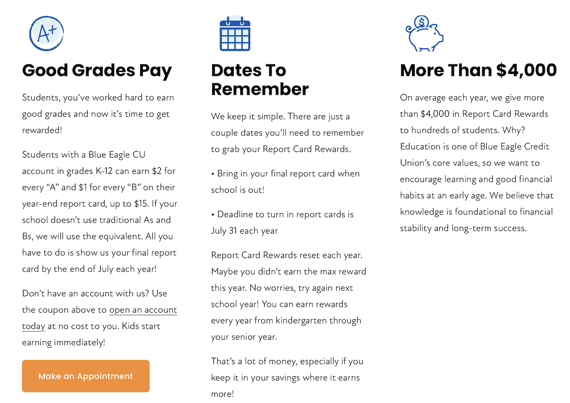 According to the credit union, annually in May, June and July, students with a Blue Eagle Credit Union account bring in final report cards to receive their financial rewards. If a student doesn’t have a Blue Eagle Credit Union account, the credit union provides a coupon on its Education Programs page to open an account at no cost to the student. It also offers the coupon for adult members.