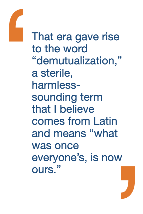 That era gave rise to the word “demutualization,” a sterile, harmless-sounding term that I believe comes from Latin and means “what was once everyone’s, is now ours.” The always-eloquent Ed Speed may call me on that definition, but you get the gist.