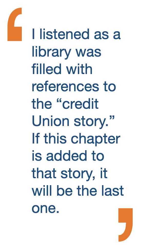 During GAC week, when I wasn’t hearing Kool-Aid references, I heard all about the “credit union family.” Family members don’t treat each other this way; they stick up for each other. I listened as a library was filled with references to the “credit Union story.” If this chapter is added to that story, it will be the last one. And I heard trade association speaker after trade association speaker exult from the main stage the glories of member-ownership, member control, and democratically run credit unions. If you believe it, DEFEND it. Or is that just Capitol Hill cover?