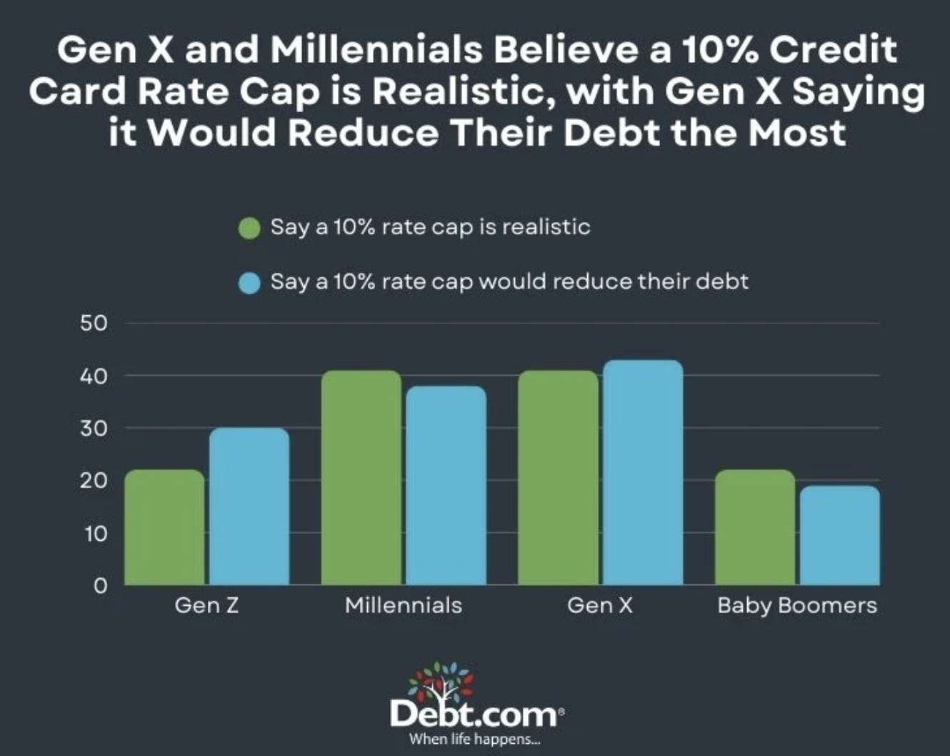 - Gen X respondents were also the most likely to say an interest rate cap would significantly reduce their debt burden, at 43%, followed by Millennials (38%), Gen Z (30%), and Baby Boomers (19%).