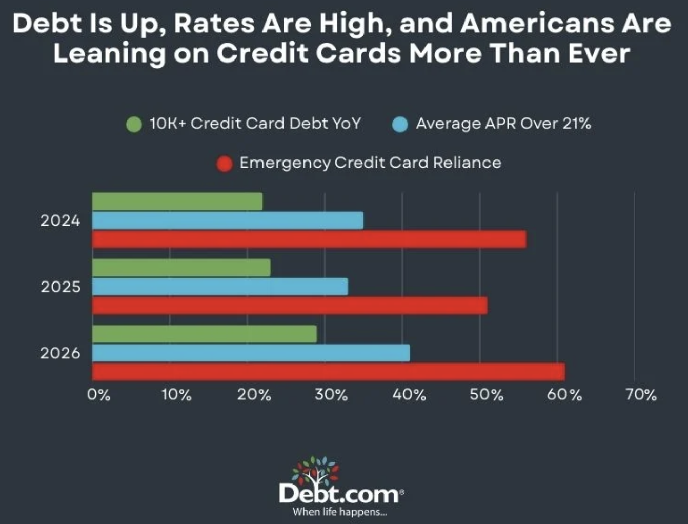 The survey also found reliance on credit cards during emergencies rising sharply. After dipping in 2025, the share of Americans who say they would turn to credit cards in an emergency climbed to 61% this year, the highest level in three years, Debt.com reported.