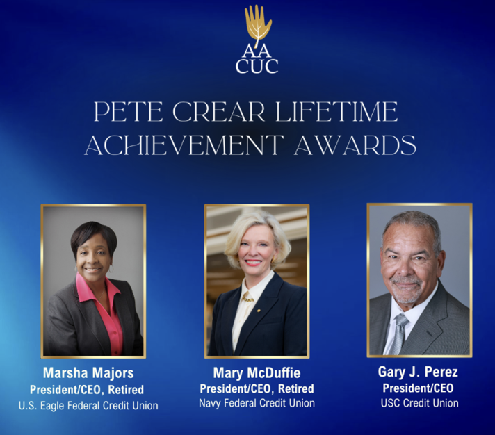 “There is extraordinary leadership across the credit union movement, and this year we are proud to recognize not one, but three exceptional leaders,” Renée Sattiewhite, president/CEO of AACUC, said in a statement. “Mary, Marsha, and Gary have each expanded access to financial services through innovation, purpose-driven leadership, and a deep commitment to the communities they serve.”