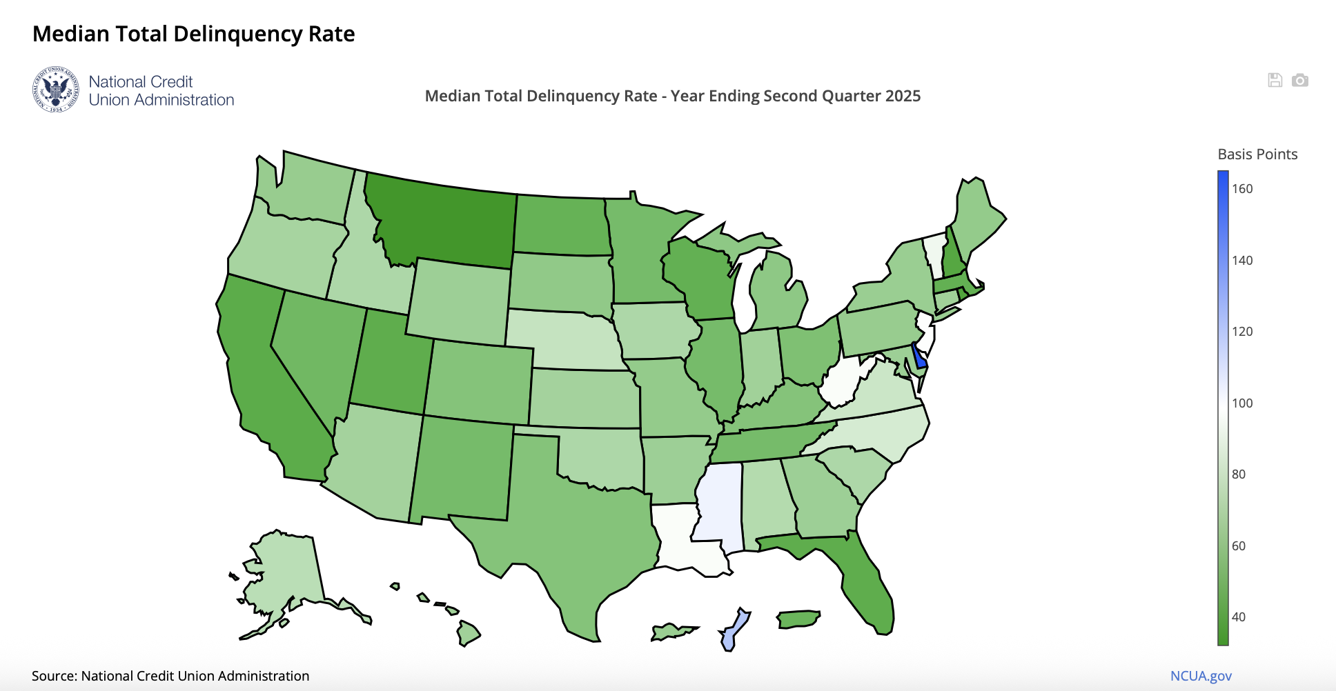 - At the end of the second quarter of 2025, the median total delinquency rate among federally insured credit unions was 65 basis points, compared with 60 basis points at the end of the second quarter of 2024.
