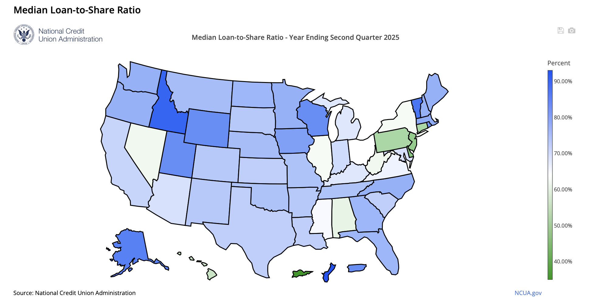 - Nationally, the median ratio of total loans outstanding to total shares and deposits – the loan-to-share ratio – was 70% at the end of the second quarter of 2025. At the end of the second quarter of 2024, the median loan-to-share ratio was 71%.
