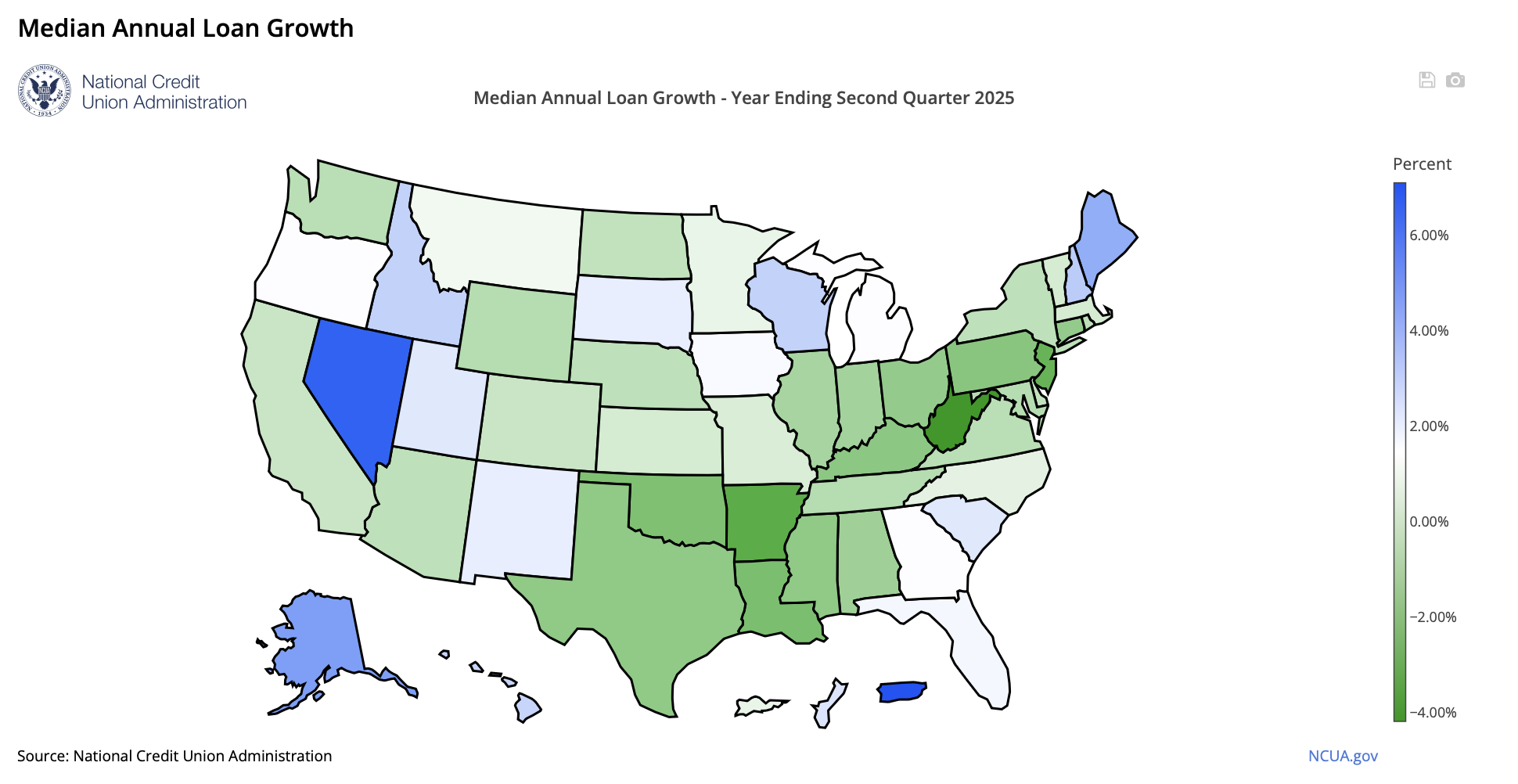 - Over the year ending in the second quarter of 2025, median loan growth was strongest in Nevada (6.6%) and Alaska (4.6%).