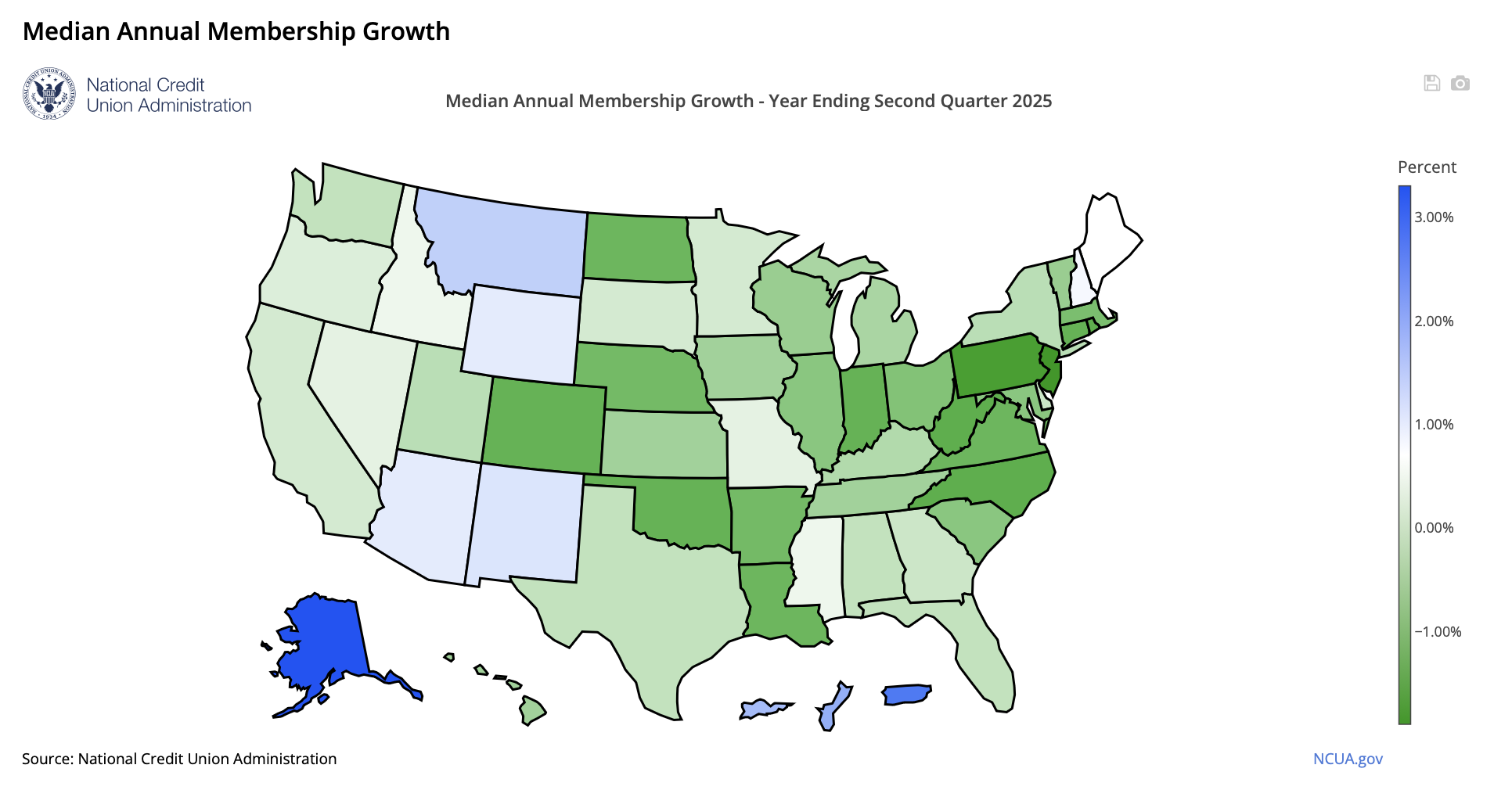 - Over the year ending in the second quarter of 2025, credit unions headquartered in Alaska (3.3%) and Montana (1.4%) experienced the strongest median membership growth.
