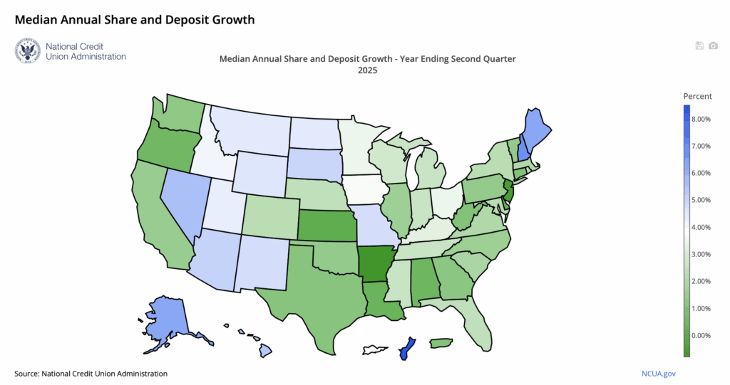 - Over the year ending in the second quarter of 2025, median growth in shares and deposits was fastest in New Hampshire (6.8%), followed by Alaska and Maine (both 6.2%).