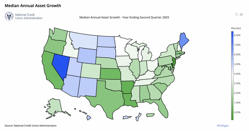 ALEXANDRIA, Va.—The new NCUA Quarterly U.S. Map Review for the second quarter of 2025 reveals that nationally assets in federally insured credit unions increased by 2.3% at the median over the year ending in the second quarter of 2025 (meaning) half of all federally insured credit unions had asset growth at or above 2.3% and half had asset growth of 2.3% or less, while the median growth rate in assets was negative 0.2%.
