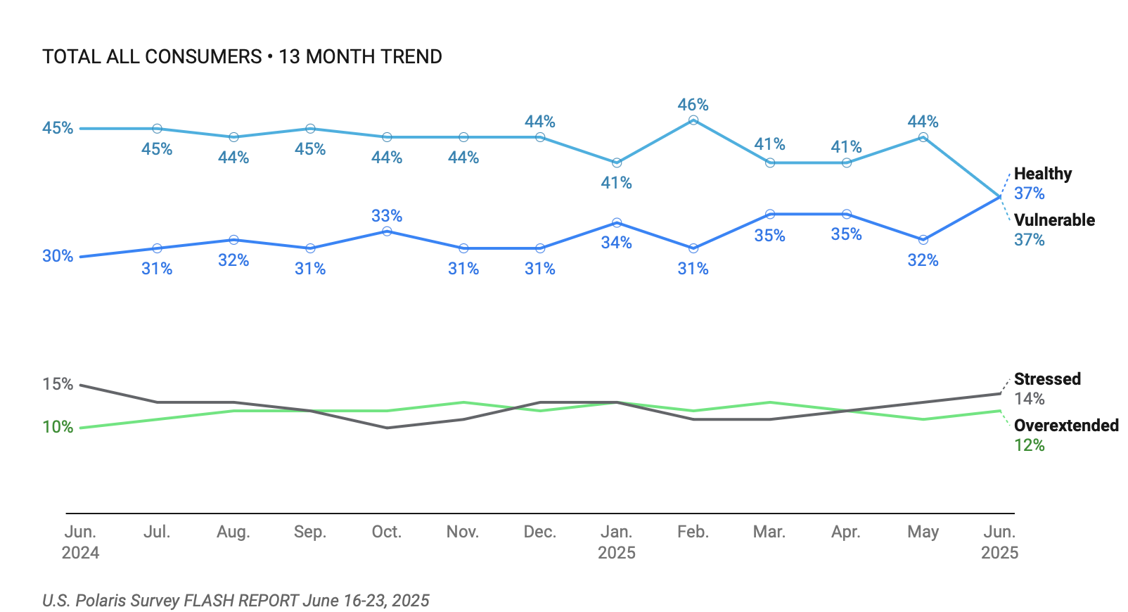 After what J.D. Power called a “discouraging turn” in May, the company’s survey of consumers who are financially healthy rose to 37% in June, which is a 13-month high.