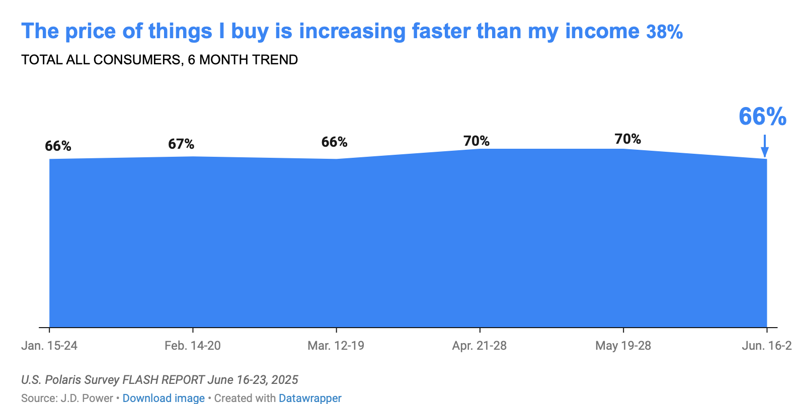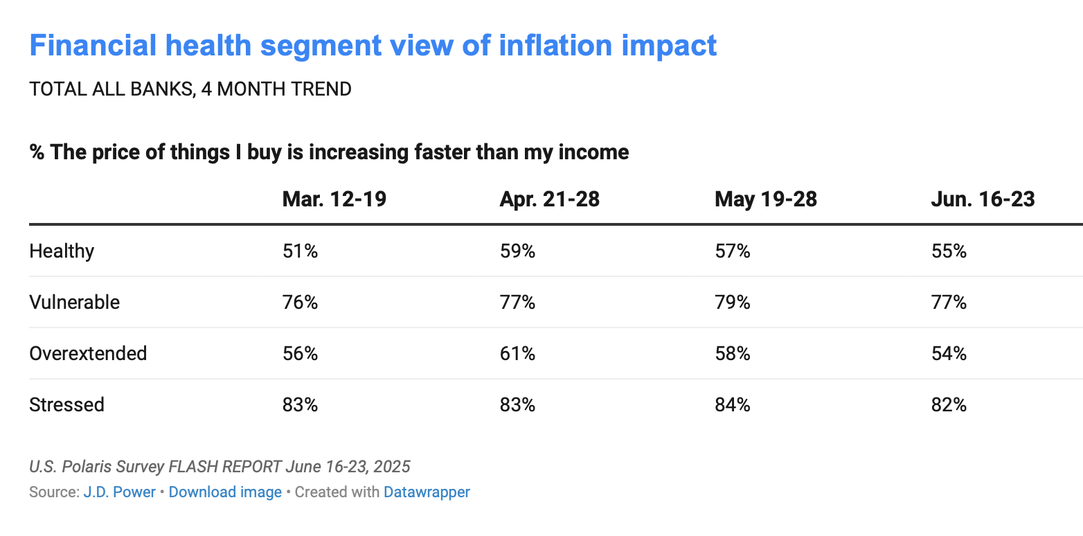 “The positive development also translated to consumers’ dealings with inflation. Nearly two-thirds (66%) of those surveyed said the cost of goods is increasing faster than their income, which reflects a monthly decline of four percentage points,” J.D. Power said. “The improvement was spread throughout all levels of consumer financial health, with consumers in the overextended category seeing the biggest monthly improvement.”