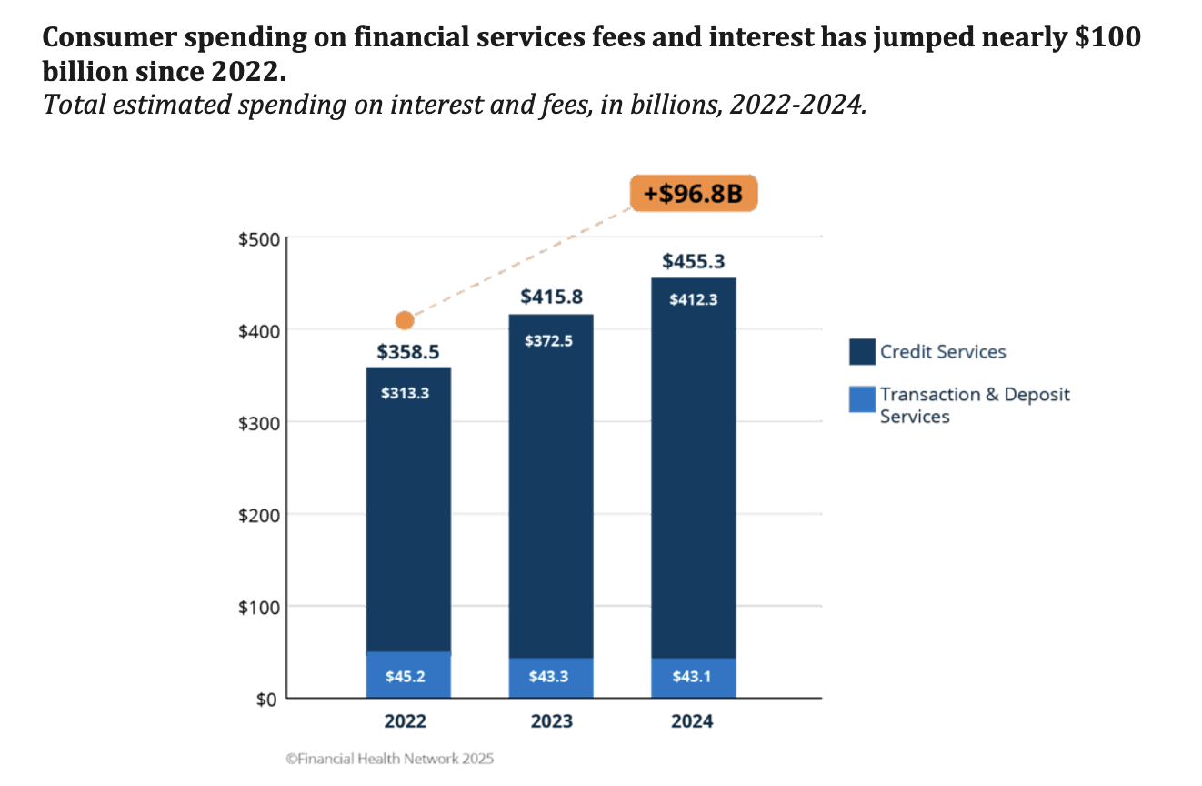 According to the FinHealth Spend 2025 Report from the Financial Health Network, which conducted the research, that $455 billion is nearly $100 billion more than in 2022. Rising credit card balances and the return of student loan payments drove much of this increase, while overdraft fees ticked upward for the first time in years, according to Financial Health Network.