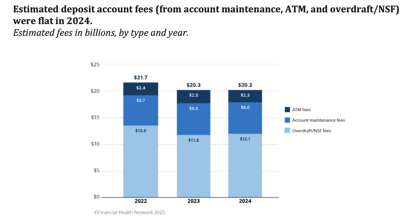 According to Financial Health Network, in 2024, households spent an estimated $43.1 billion on transaction and deposit fees – essentially flat compared with 2023.