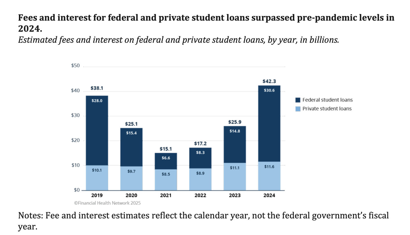 “For the first time in years, many borrower households faced a full calendar year of payments, and fees and interest on federal student loans more than doubled to an estimated $30.6 billion, surpassing pre-pandemic levels,” Financial Health Network said.
