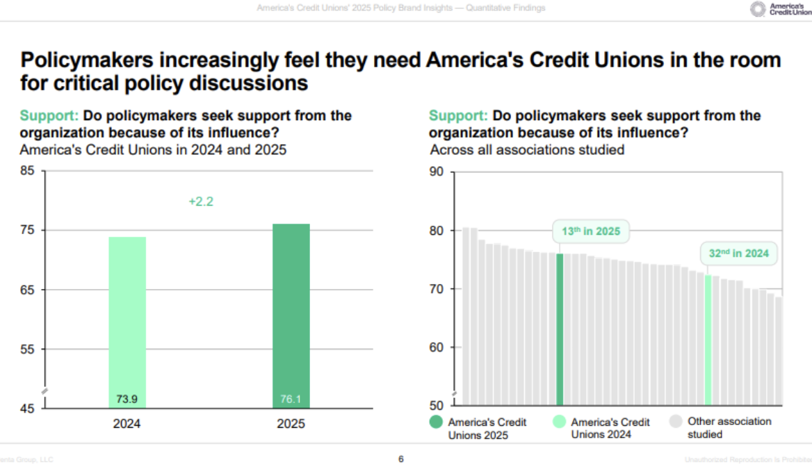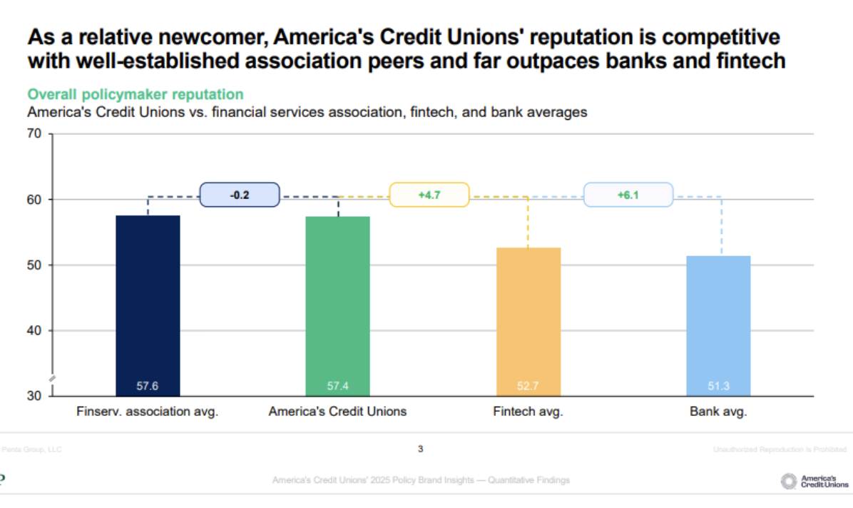“America’s Credit Unions’ reputation among policymakers is on par with long-established financial services associations and far ahead of banks and fintechs,” Pentagroup said. “America’s Credit Unions has built a high degree of credibility among this audience, underscoring that credit unions’ voice is essential in shaping financial policy.”
