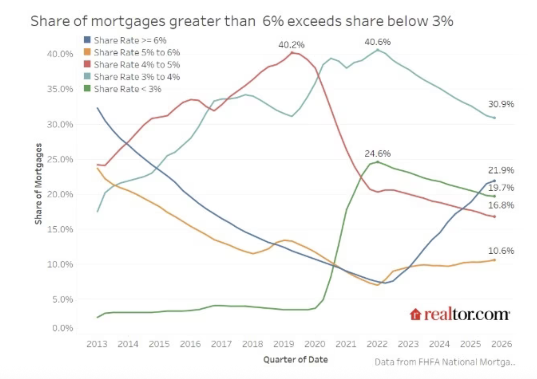 According to Realtor.com, the share of mortgages with rates below 3% fell to 19.7% in the fourth quarter from 20% in the prior quarter, while loans in the 3% to 4% range declined to 30.9% from 31.5%. At the same time, higher-rate mortgages continued to rise, with the 5% to 6% category reaching 10.6% and those above 6% climbing to 21.9%.