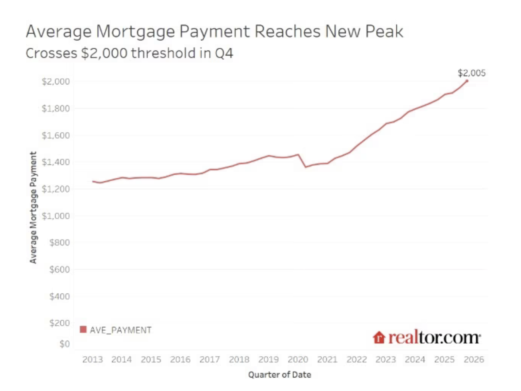 NEW YORK — The average monthly mortgage payment for U.S. homeowners surpassed $2,000 for the first time at the end of 2025, underscoring the continued strain from high home prices and elevated interest rates, according to a report by Realtor.com.