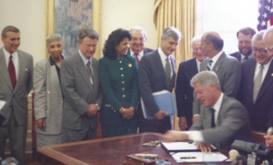 Below, Buck Levins appears third from left in Oval Office on August 7, 1998, as President Clinton signs HR 1151 into law.