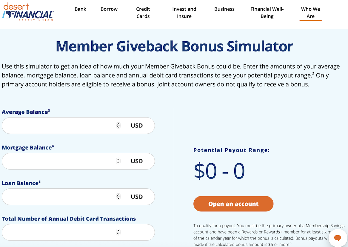 The credit union has a microsite, desertfinancial.com/bonus, where members can learn more and also see what their bonus could be, as shown below.