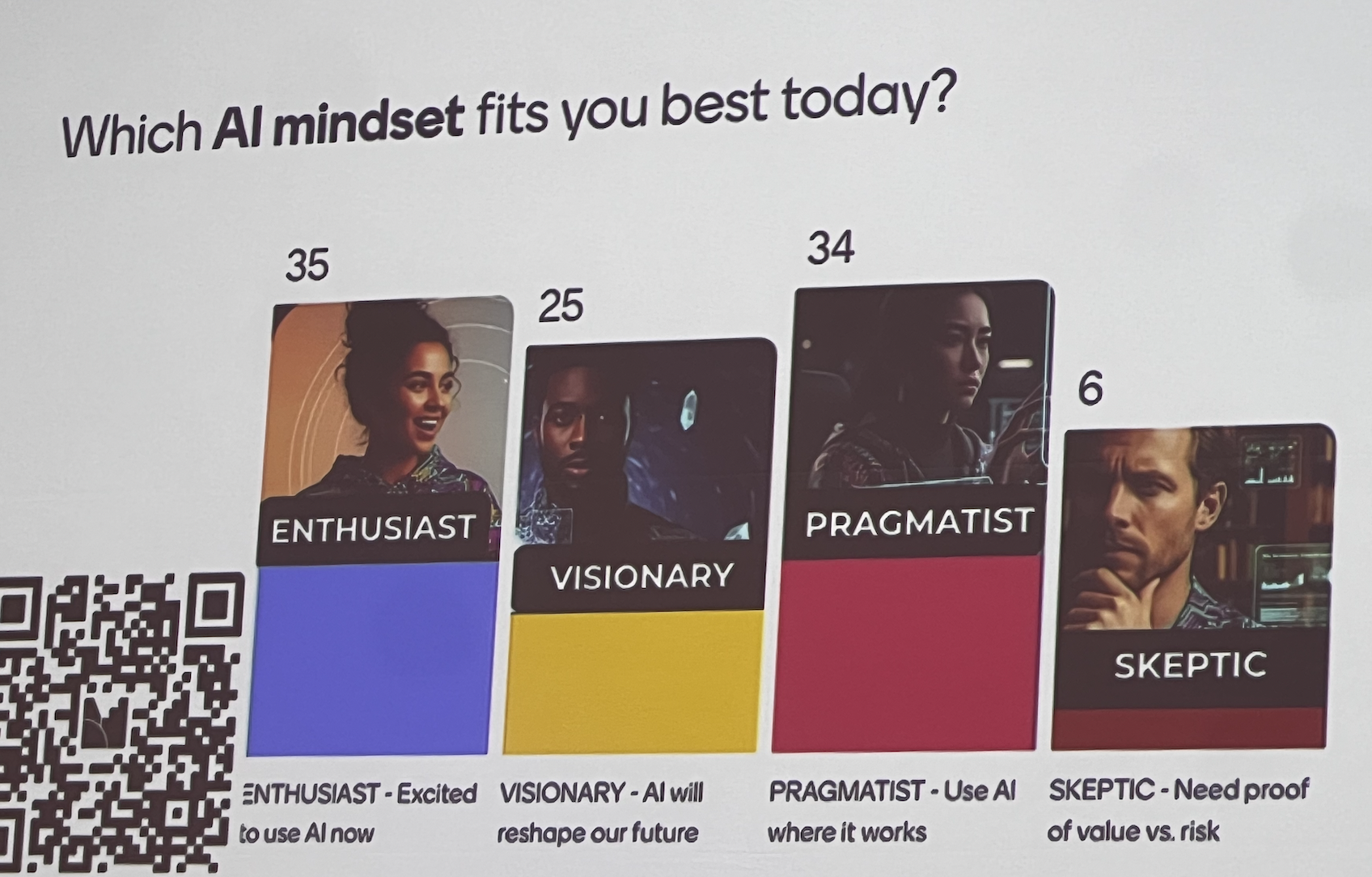 When attendees were polled on how they would describe themselves in relation to AI — enthusiast, visionary, pragmatist or skeptic — the results were nearly evenly split. Pragmatist edged out enthusiast by one vote, with visionary close behind.