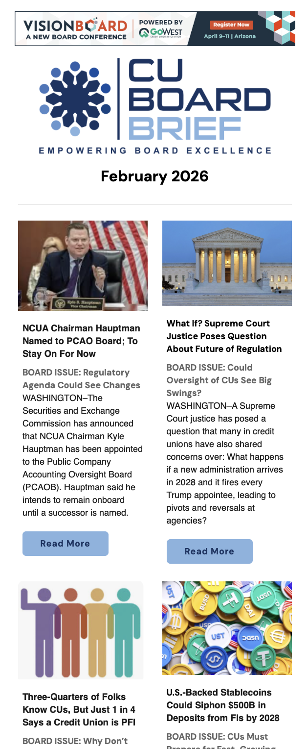 “The CU Board Brief has been carefully tailored to members of board with an overview of broad issues they should be aware of, without getting into specific issues that are the purview of management,” said Frank J. Diekmann, Cooperator-in-Chief with the CU Daily. “Feedback from board members and CU leaders has been terrific for this easy-to-digest report. We are happy to be able to play such a role in keeping board members educated.”