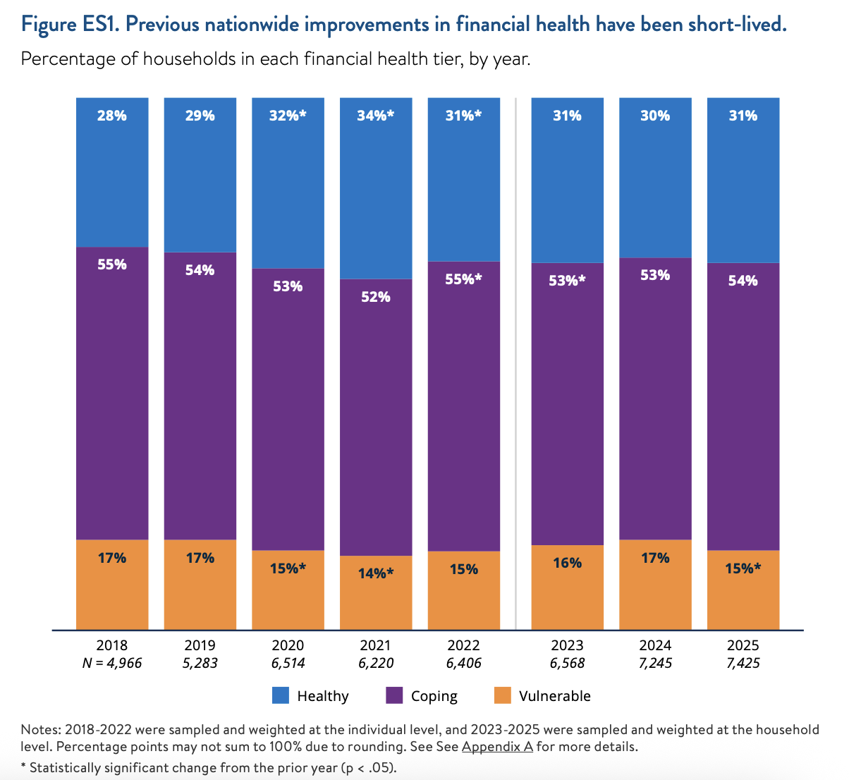 “After two years of rising distress, the past year’s modest decrease in financial vulnerability signals that cooling inflation and a stable job market have given some struggling households breathing room in their budgets,” the organization said in summarizing its findings. “Despite this progress, the share of households who are financially healthy has not meaningfully increased since 2022.