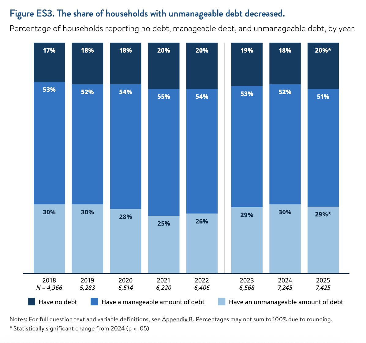 • The percentage of households reporting an unmanageable amount of debt decreased from 30% to 29%.