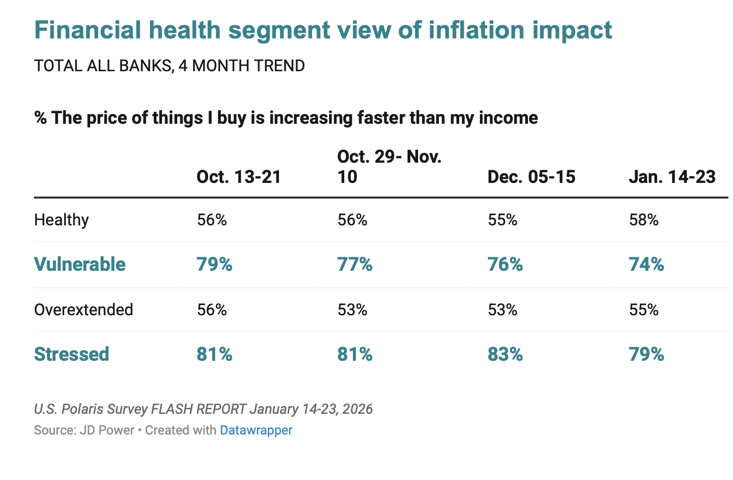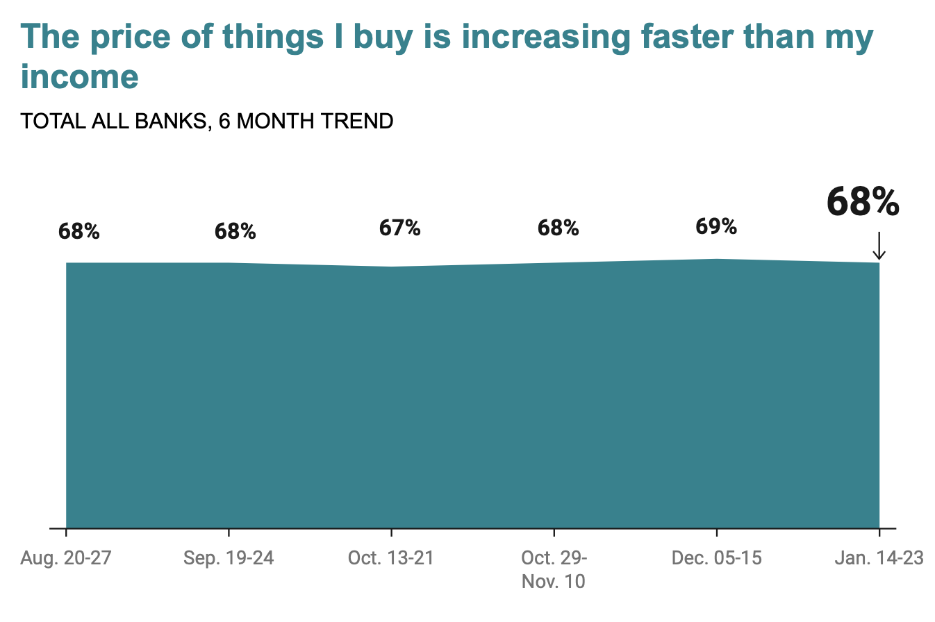 “The persistently high price of consumer goods has become an accepted reality,” it said in its analysis. “Overall, 68% of consumers say the price of goods is increasing faster than their income in January, largely in line with the rate of the past six months. This could be an indication that prices have had a snowball effect, and consumers are finally reaching a tipping point. Vulnerable (74%) and stressed (79%) consumers have notably higher levels of concern regarding inflation.”