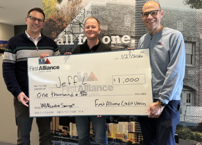 ROCHESTER, Minn.–First Alliance Credit Union is proud to announce that two of its members, both also long-time employees, were prize winners through the annual WINcentive Savings program, a statewide initiative designed to reward positive saving habits.