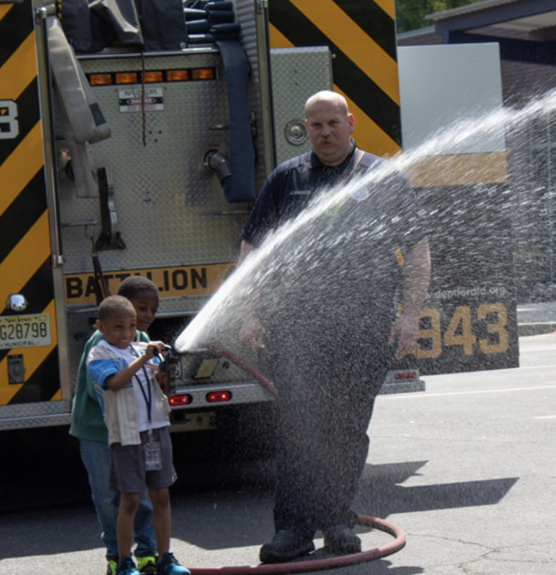Deptford Fire Department visits First Harvest Credit Union for Bring Your Child to Work Day event teaches participants how to operate the fire hoses.