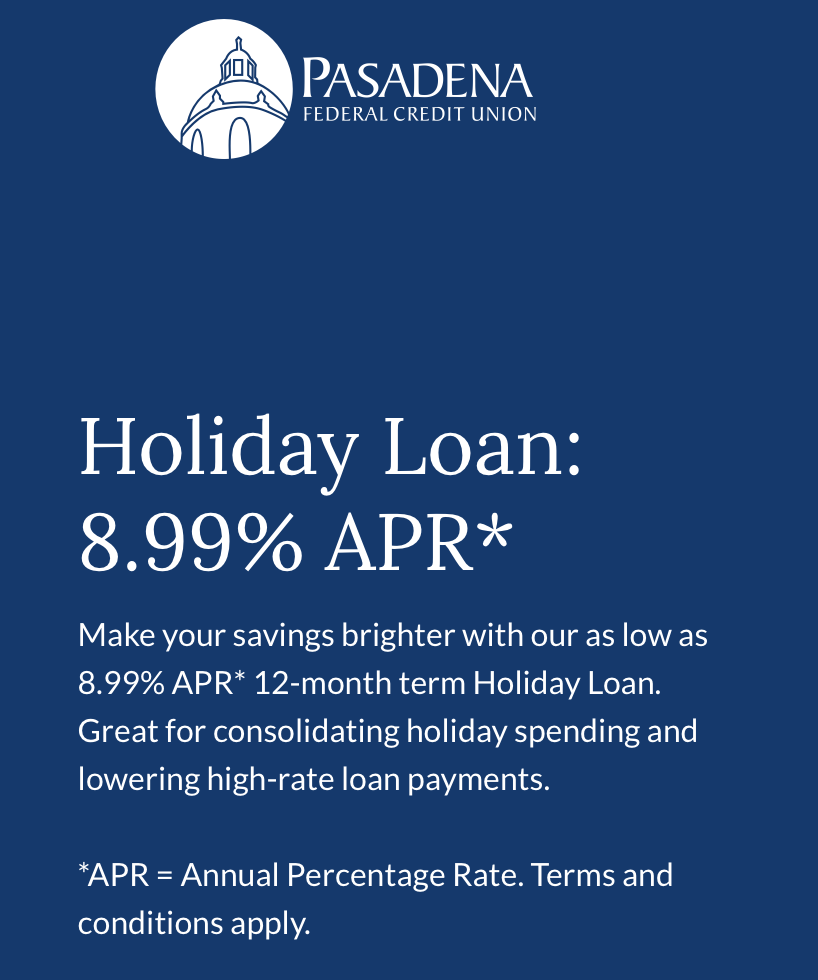 Pasadena Federal said its Holiday Loan offers an alternative with a fixed rate typically far lower than credit card APRs and the ability for borrowers to consolidate debt into a single manageable payment, potentially saving money on interest charges and providing a clear repayment timeline.