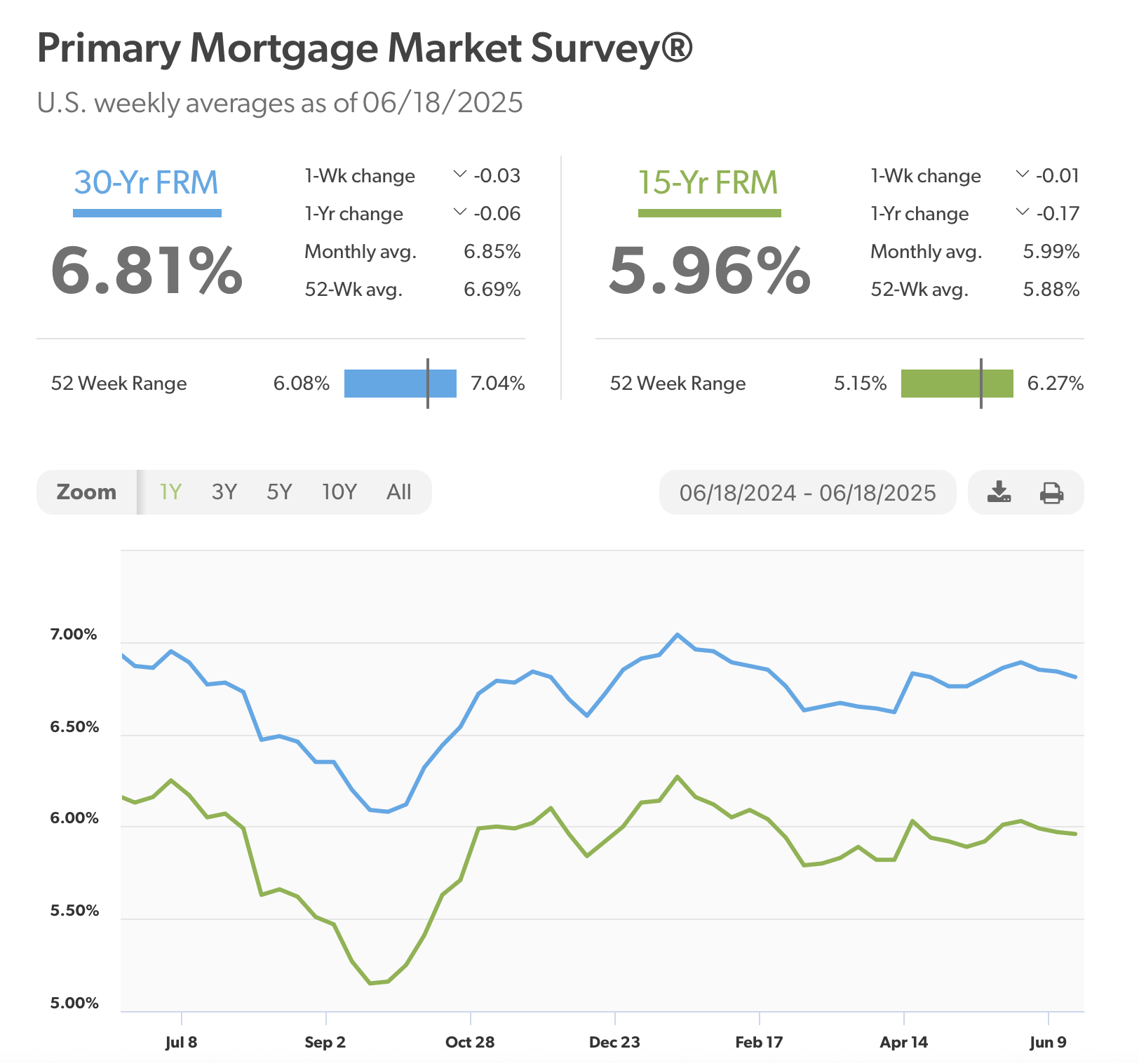 Both the 30-year and 15-year rates remain above their respective 52-week averages of 6.69% and 5.88%, the Freddie Mac data show.