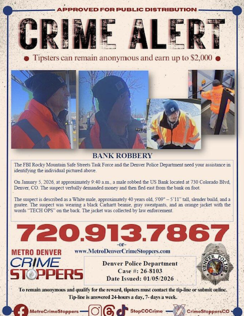 The Denver Police Department and the FBI local office distributed surveillance photos of the robber hours after the incident.