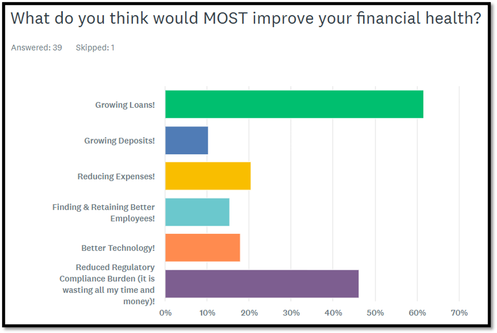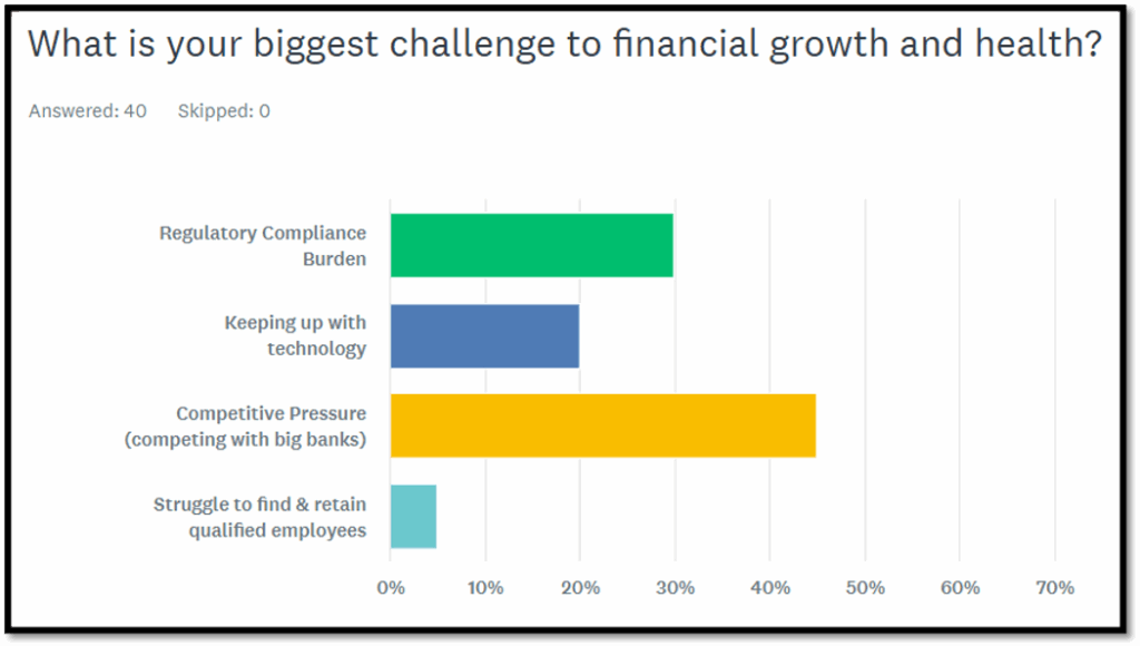 - Competitive Pressure (growing loans), followed by the Regulatory Compliance Burden were their biggest obstacles to financial growth and health.