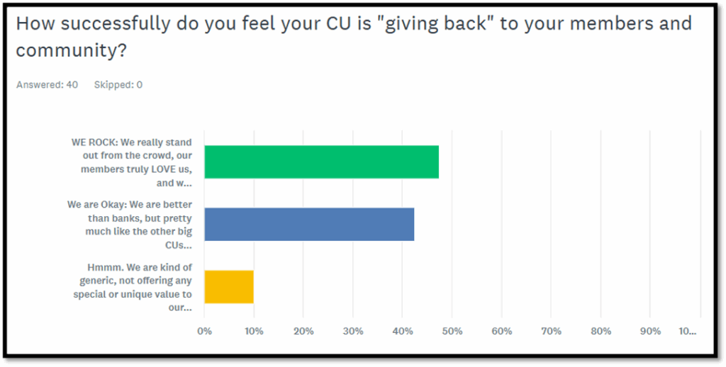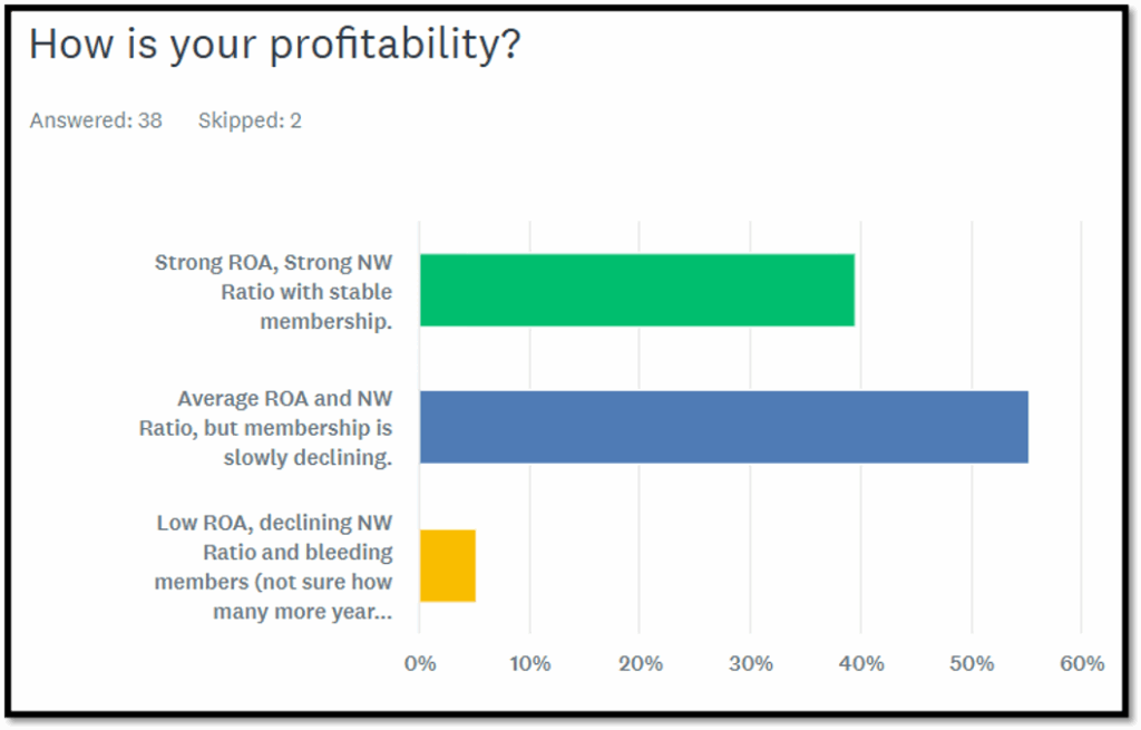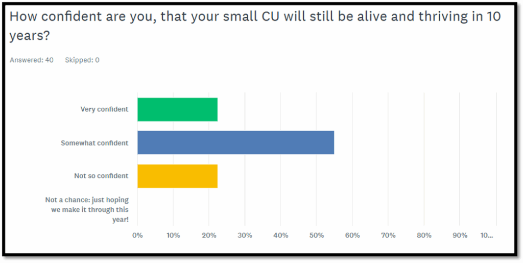 - In closing, although most of the small credit unions reported average or strong ROA and NW ratios, nearly 75% of them aren’t terribly confident they will still be alive and thriving 10 years from now. That’s a concern.