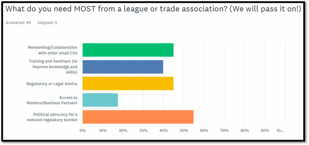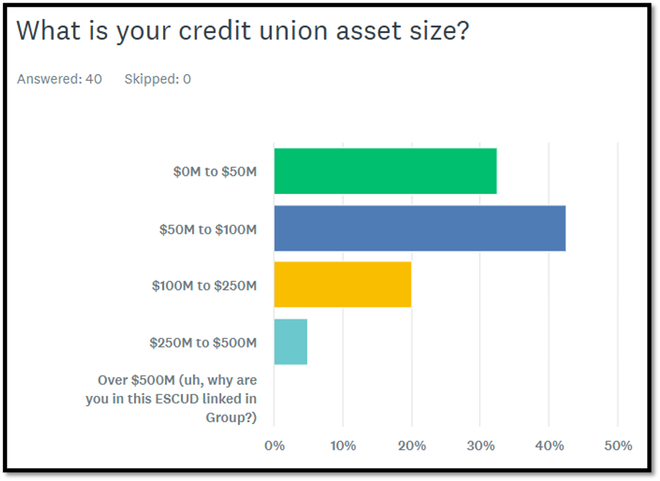I received 40 responses to my small credit union survey, pretty robust for just a single week! Seventy-five percent of these were from credit unions under $100 million in assets, so I was able to really get the “small” CU perspective.
