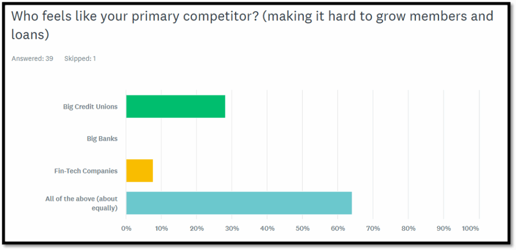 - Nearly 30% of these small credit unions consider big credit unions alone (not banks) as their primary competitor, when it comes to growing loans and members.
