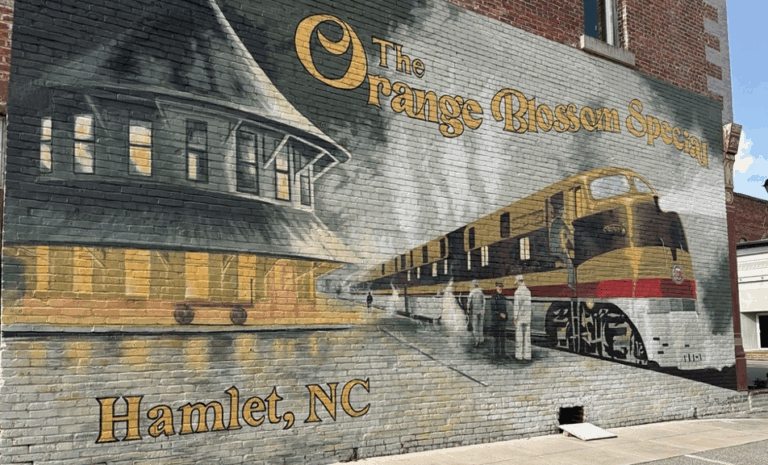 Titled “The Orange Blossom Special,” the mural “captures the energy and spirit of Hamlet’s past — depicting the illuminated historic depot, conductors at work, and a sense of motion that feels both nostalgic and full of life,” according to Summerville, S.C.-based REV FCU.