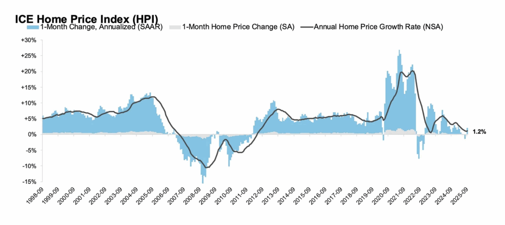 “Annual home price growth rose to +1.2% in September after eight months of slowing, driven by falling inventory and improved affordability. Nationally, listings remain 17%–19% below 2017–2019 norms, as sellers in previously oversupplied markets delay sales to avoid price cuts,” ICE stated.