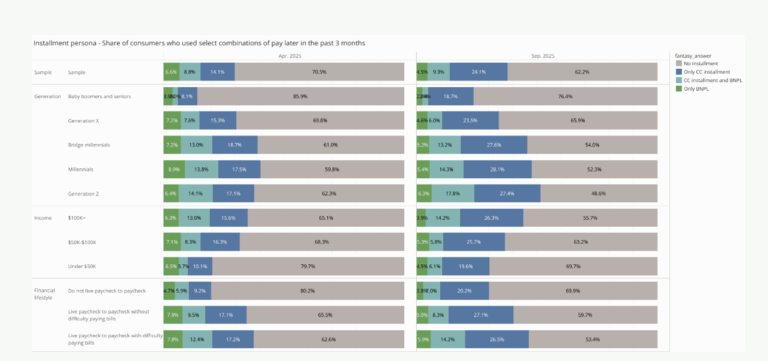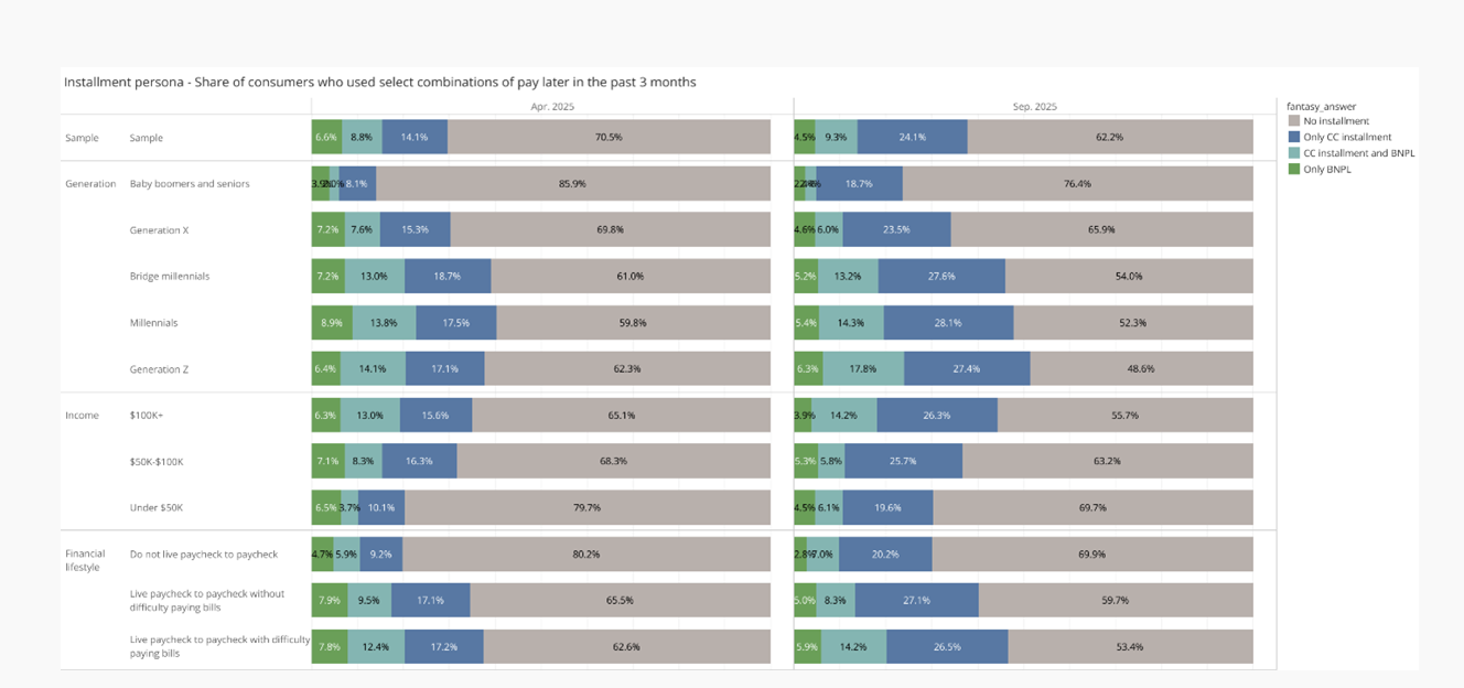 • Income also shapes behavior: 45% of Gen Z and 42% of millennials used installments, while 70% of households under $50,000 still avoided them entirely.