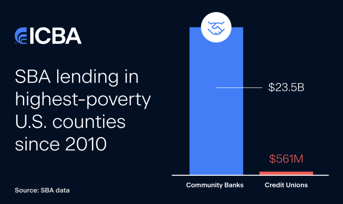 - In the highest-poverty counties, community banks accounted for 76.5% of SBA lending, compared with just 1.8% from credit unions—”showing community banks dramatically and disproportionately outperformed credit unions in meeting commercial lending needs in high-poverty areas.”