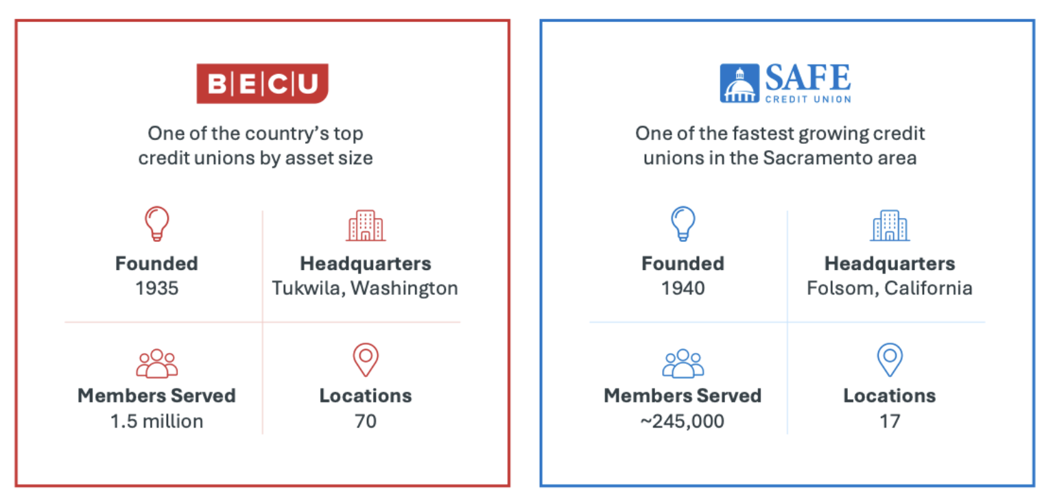 SAFE and BECU announced in November 2025 that they plan to combine, pending regulatory and member approval. The combined entity would have roughly 1.8 million members and more than $33 billion in assets, making it one of the largest credit unions in the United States.