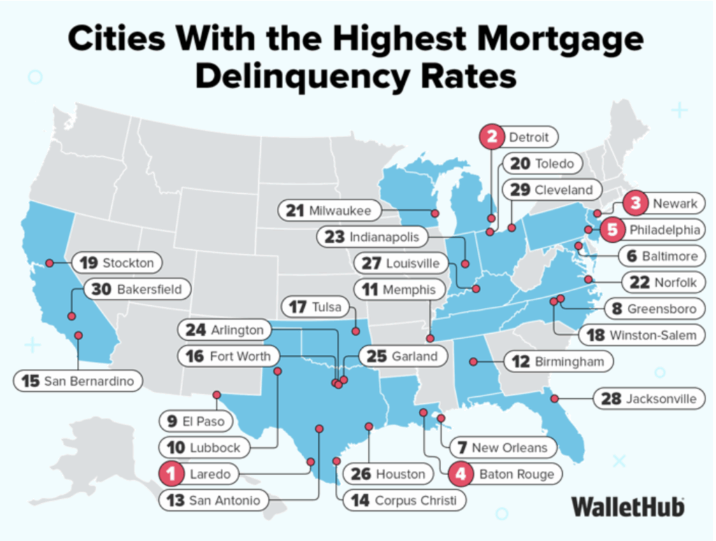 According to WalletHub, cities with the highest levels of mortgage delinquencies include: