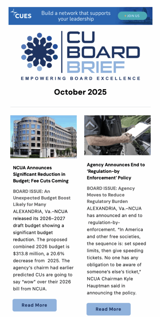 The CU Board Brief has been designed to meet directors’ educational requirements by informing them of big-picture issues taking place in credit unions and financial services and to provide potential discussion points in the boardroom while not overwhelming readers with too much information.