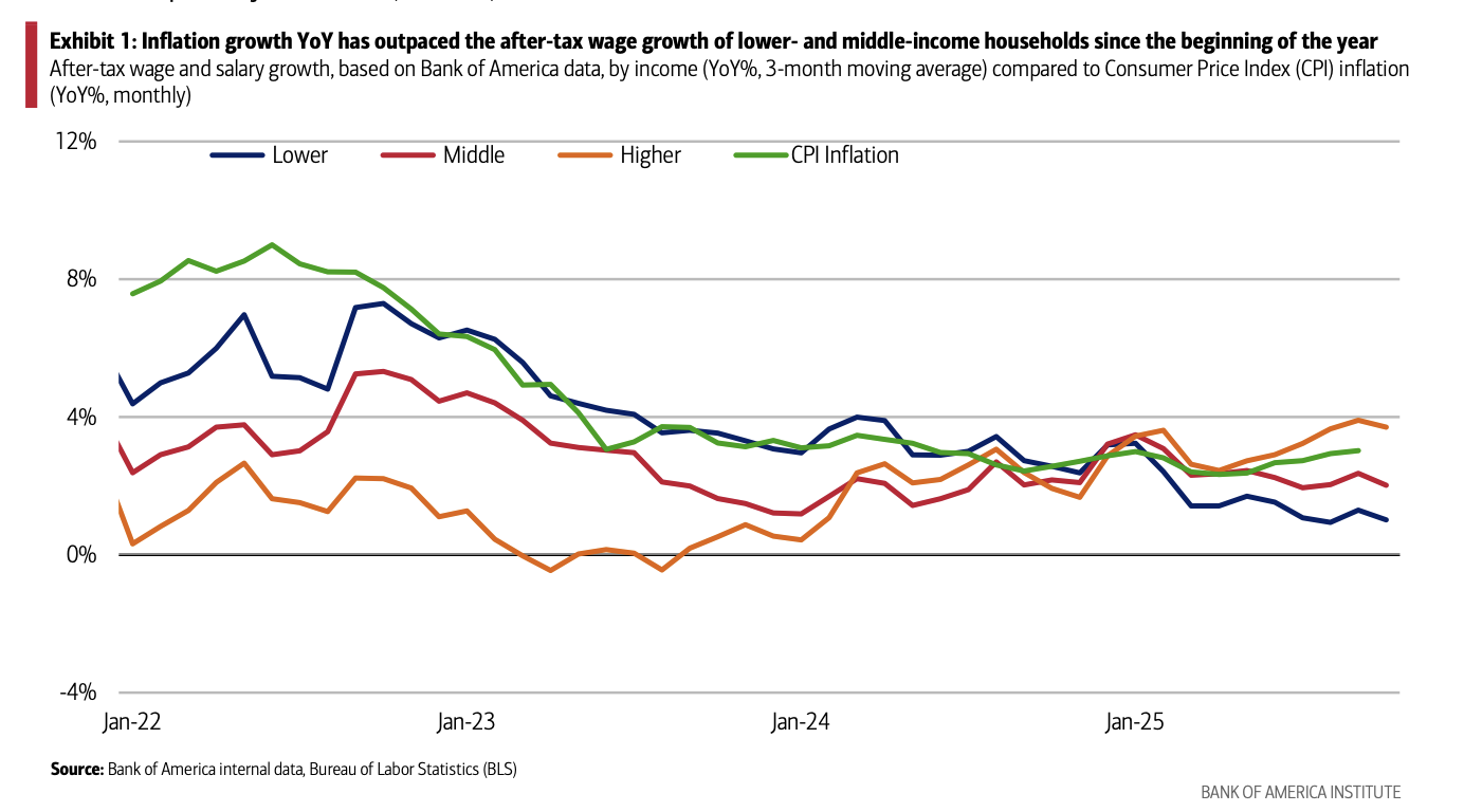 Inflation remains the central pressure point, the study found. Consumer prices rose 3% year-over-year in September, the report said, outpacing wage and salary growth for middle- and lower-income households, whose take-home pay increased only 2% and 1%, respectively, in October. That marks the return of a 2024 pattern in which households’ purchasing power eroded even as inflation cooled from pandemic-era highs.
