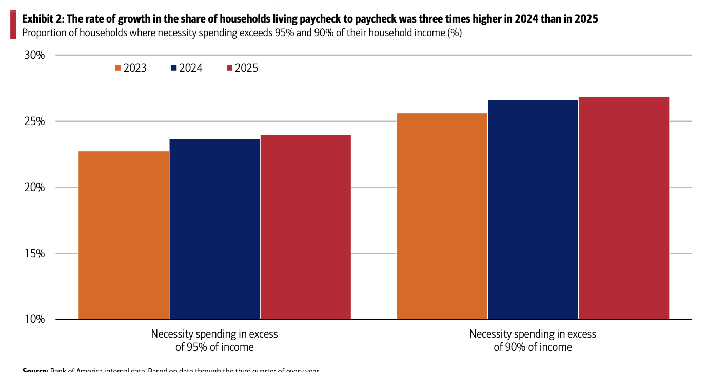 Lower-income households are driving virtually all of the increase in those living paycheck to paycheck. Roughly 29% of lower-income families fell into this category in 2025, up from 28.6% last year. Middle- and higher-income groups saw little or no movement. Bank of America analysts attributed the widening divide to slowing wage gains among lower earners after several years in which pay grew fastest for that group.