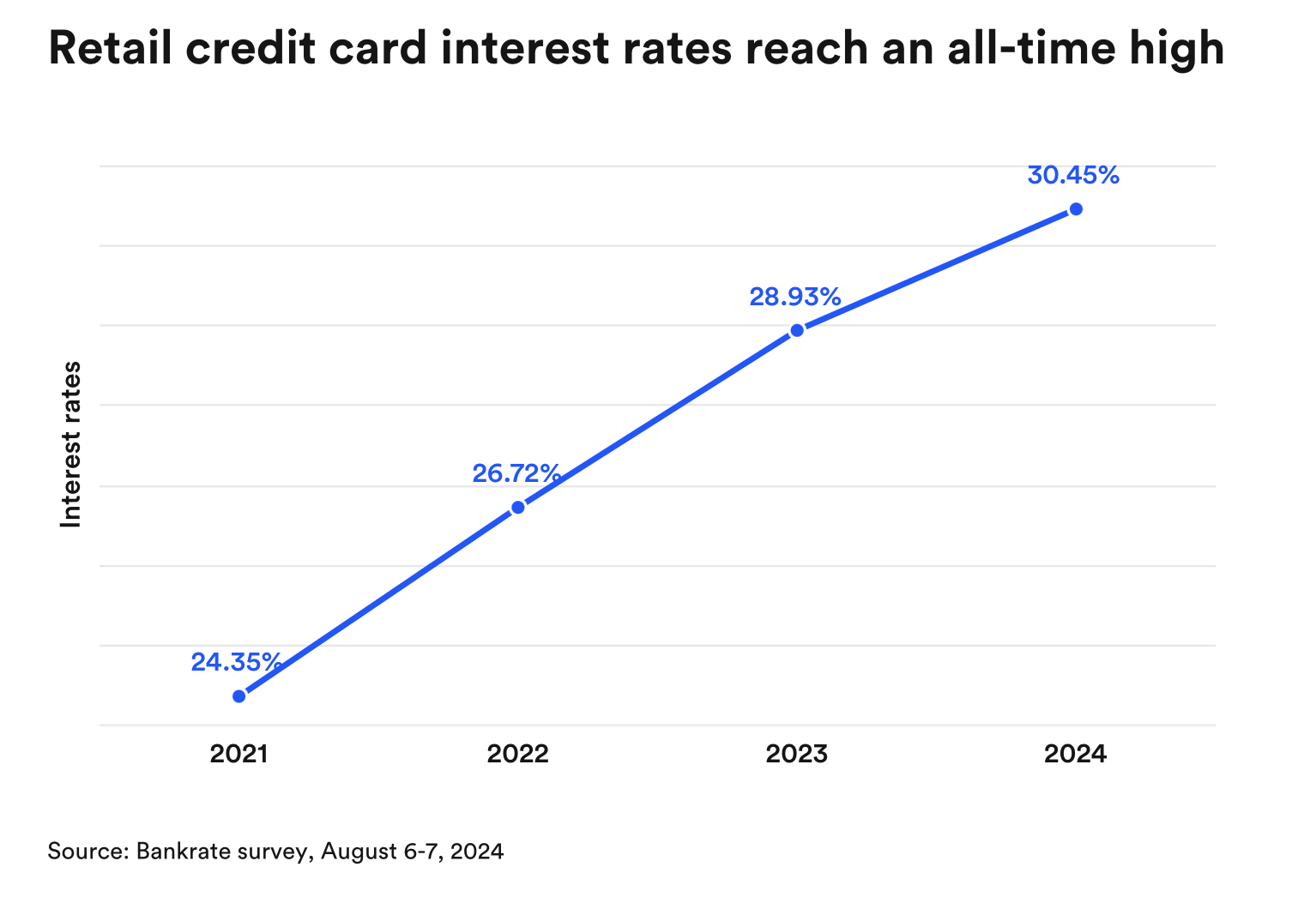 NEW YORK–The average annual percentage rate (APR) of retail credit cards remains near a record high average of 30.14% APR in 2025, according to Bankrate’s annual Retail Cards Study.