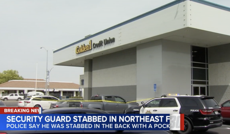FRESNO, Calif.–A security guard at a branch of Golden 1 Credit Union was stabbed here.