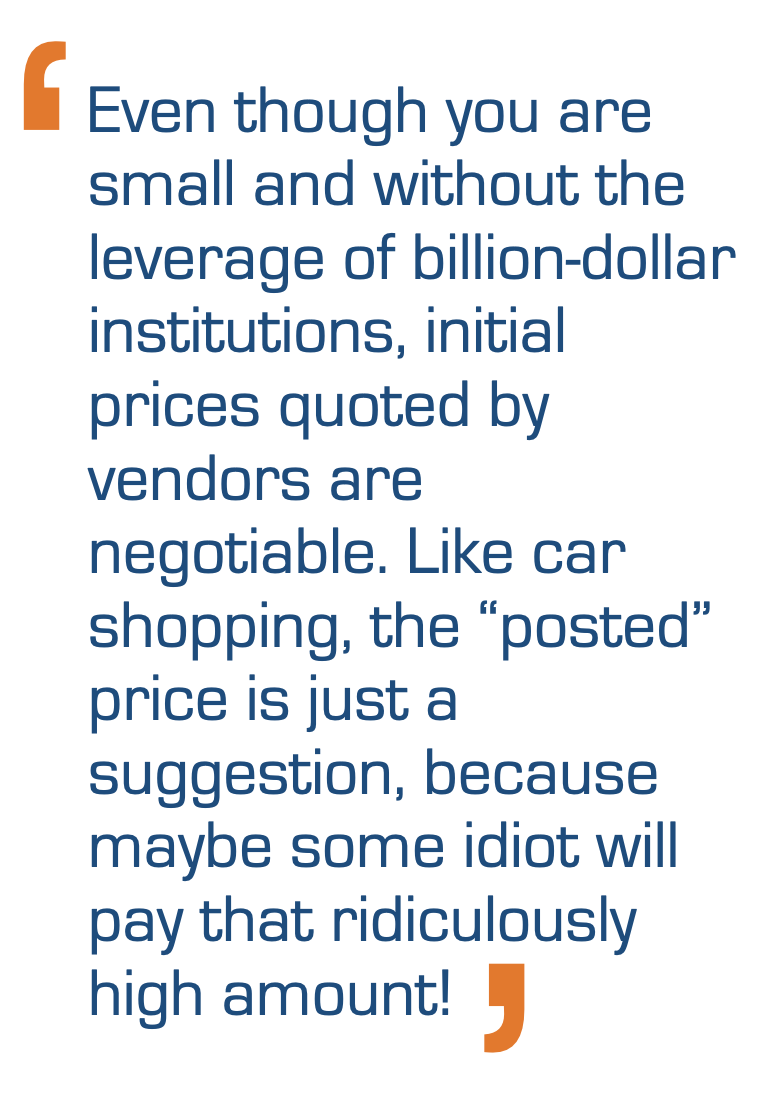 Even though you are small and without the leverage of billion-dollar institutions, initial prices quoted by vendors are negotiable. Like car shopping, the “posted” price is just a suggestion, because maybe some idiot will pay that ridiculously high amount! When looking at the price, remember to focus on the recurring monthly expense and not just the one-time up-front implementation cost.