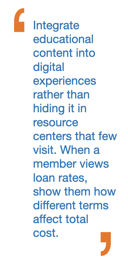 Second, integrate educational content into digital experiences rather than hiding it in resource centers that few visit. When a member views loan rates, show them how different terms affect total cost.